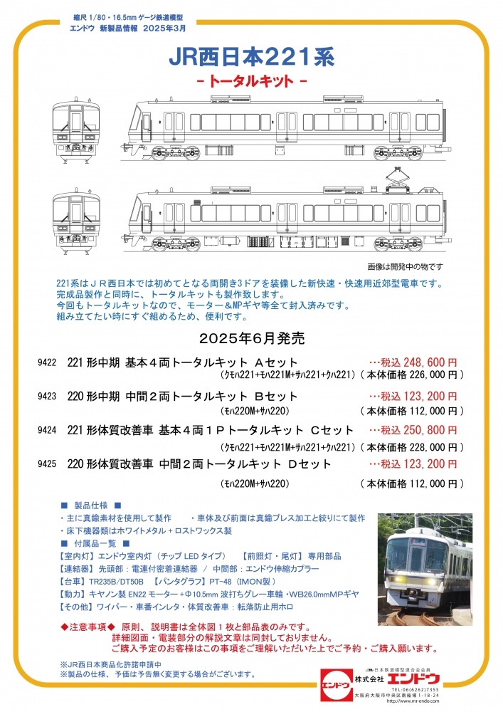 JR西日本221系 221形 中期 基本4両 トータルキット Aセット 品番:9422 販売価格 248,600円 (税込・送料無) 個数1 2 3 4 5 6 7 8 9 10 個 △ ○・・・在庫有 △・・・残りわずか Tweet この商品に関するお問合せ お気に入りアイテム登録数:0人 現金の場合11,300ポイント還元 ■ 車両について ■ 221系はJR西日本では初めてとなる両開き3ドアを装備した新快速・快速用近郊型電車です。 ■ 製品仕様 ■ トータルキットなので、モーター&MPギヤ等全て封入済みです。 組み立てたい時にすぐ組めるため便利です。 ・主に真鍮素材を使用して製作 ・車体及び前面は真鍮プレス加工と絞りにて製作 ・床下機器類はホワイトメタル+ロストワックス製 ■ 付属品一覧 ■ 【室内灯】エンドウ室内灯(チップLEDタイプ) 【前照灯・尾灯】専用部品 【パンタグラフ】PT-48 (IMON製) 【連結器】先頭部:電連付密着連結器 / 中間部:エンドウ伸縮カプラー 【台車】TR235B/DT50B 【動力】キヤノン製EN22モーター+Φ10.5mm波打ちグレー車輪・WB26.0mmMPギヤ 【その他】ワイパー・車番インレタ・体質改善車:転落防止用ホロ